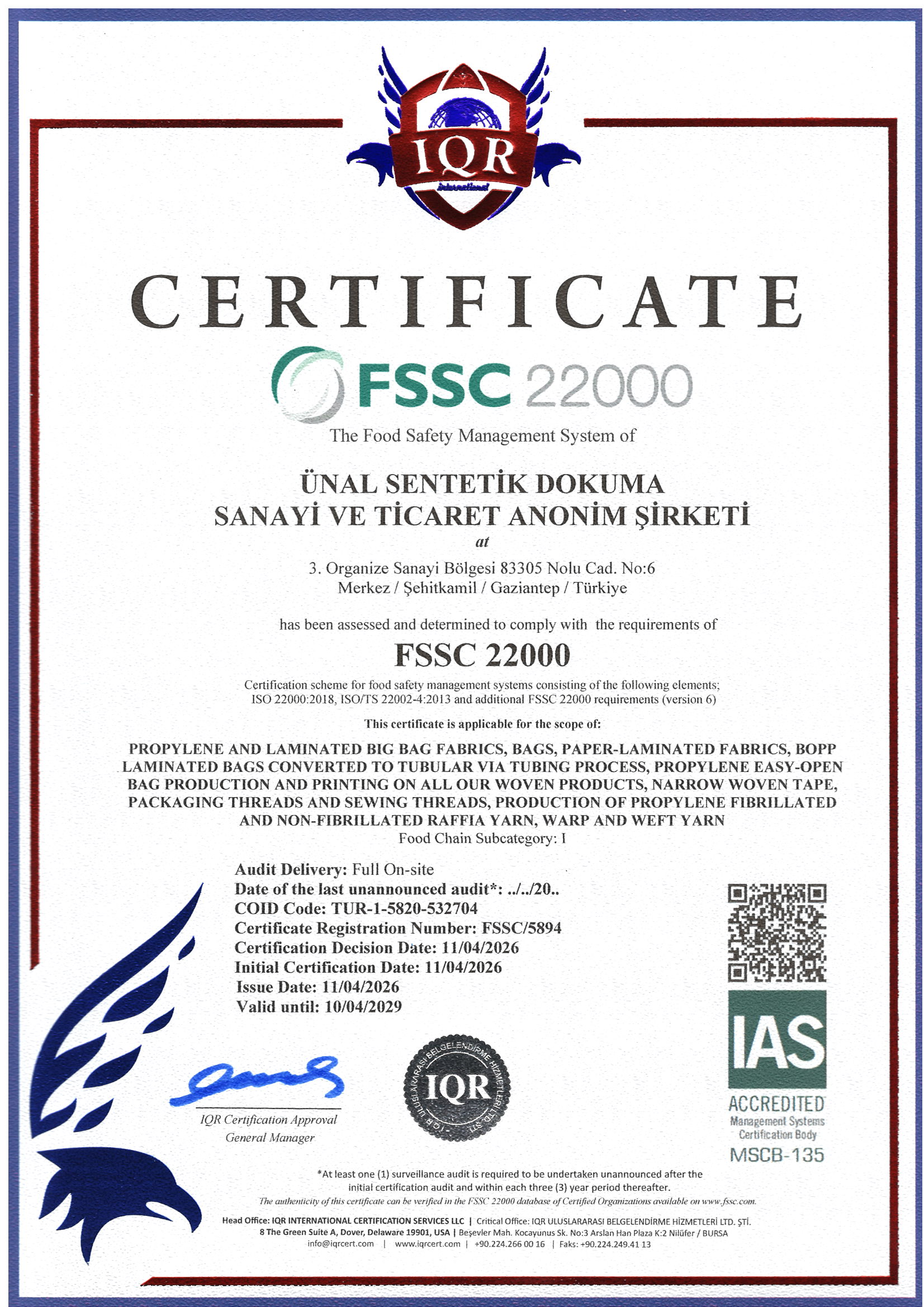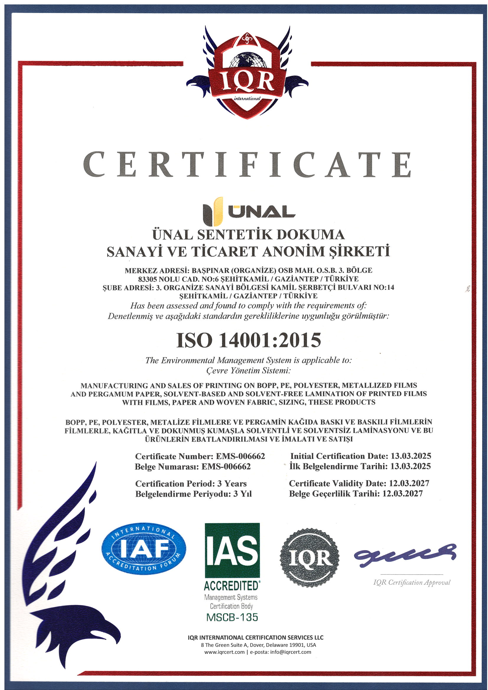 En tant qu'ÜNAL SENTETİK DOKUMA SAN. VE TİC. A.Ş., nous nous engageons à respecter les réglementations légales nationales et internationales et les autres exigences, à fournir les informations et les ressources nécessaires avec un système de gestion intégré basé sur l'amélioration continue.